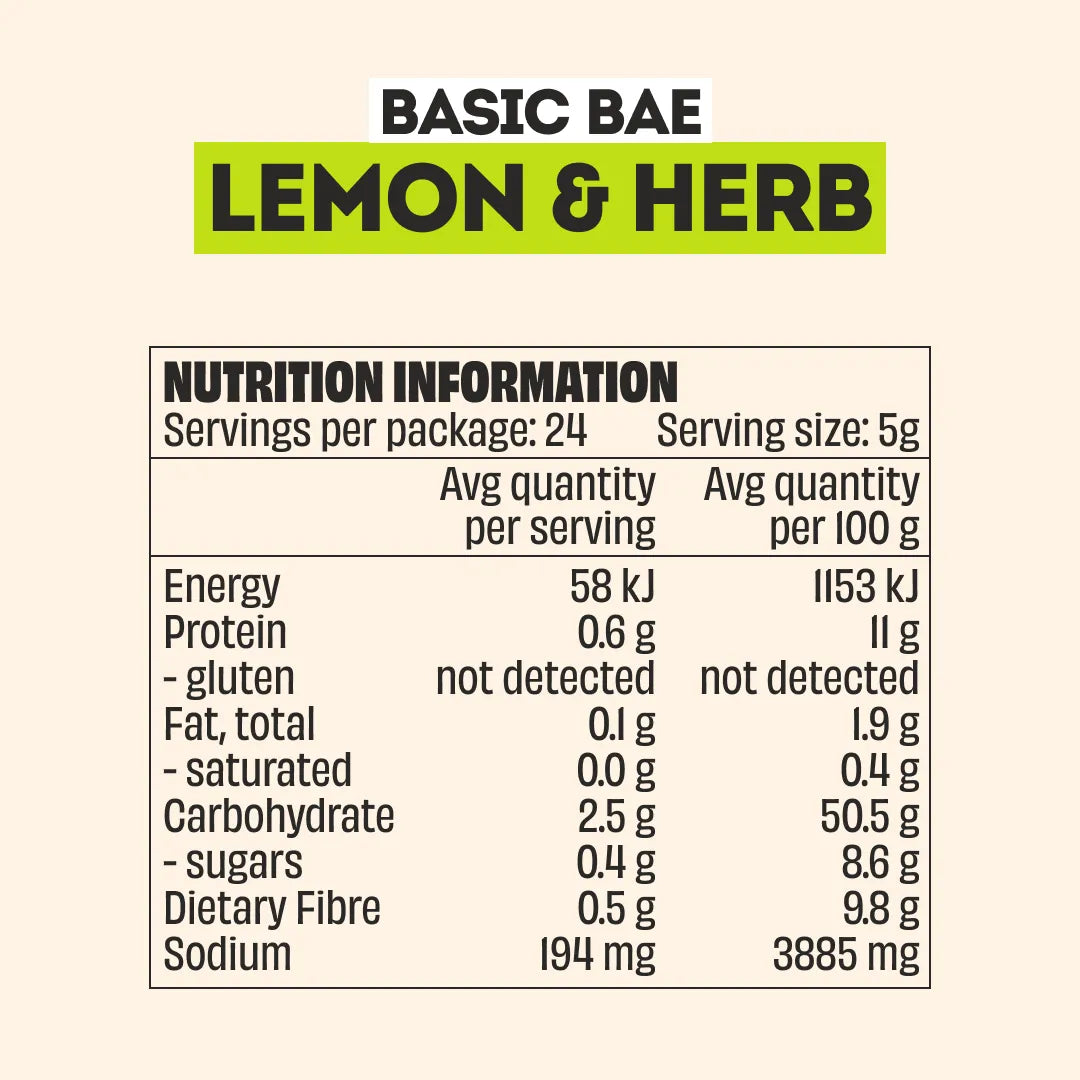Ingredients: Garlic, Onion, Pink Himalayan Salt, Vitamin C, Paprika, Vinegar Powder, Red Bell Pepper, Herbs (3.3%) (Parsley, Basil, Marjoram), Nutritional Yeast, Lemon Juice Powder (0.5%), Rice Hulls, Herb Extracts (0.4%) (Basil, Thyme), Chilli, Lemon Oil (0.25%), ![]()