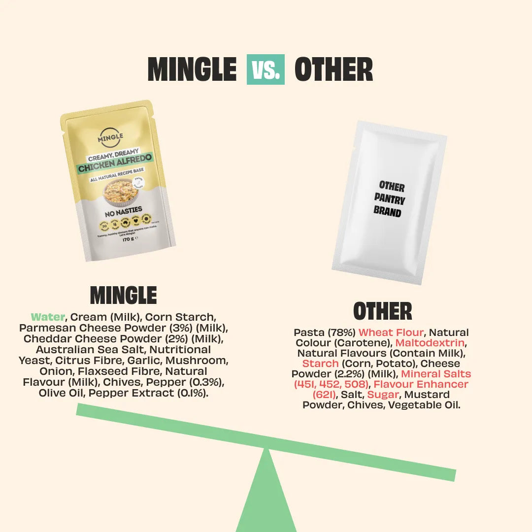 Mingle’s recipe bases were created after realising that current supermarket seasonings had a range of hidden nasties. A lot of pantry products in the supermarket contain ingredients like added refined sugar, artificial ingredients, fillers, highly processed oils and preservatives.