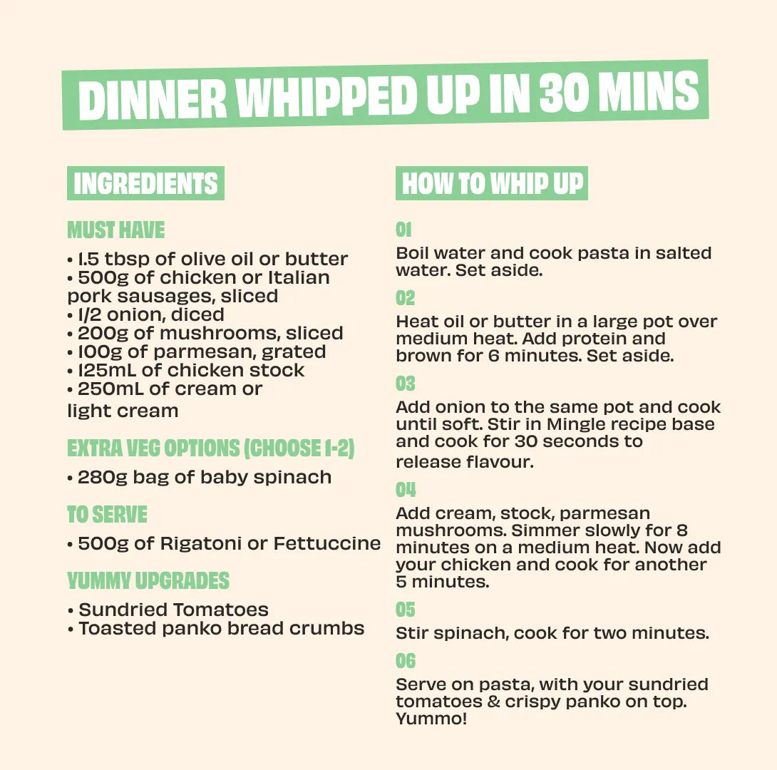 MINGLE’S Alfredo Recipe Base is rich, creamy, and velvety smooth. It is pasta night made easy, without the hidden junk. Serving creamy Alfredo is a nostalgic 90s flashback, a comfort food classic made better with Mingle.