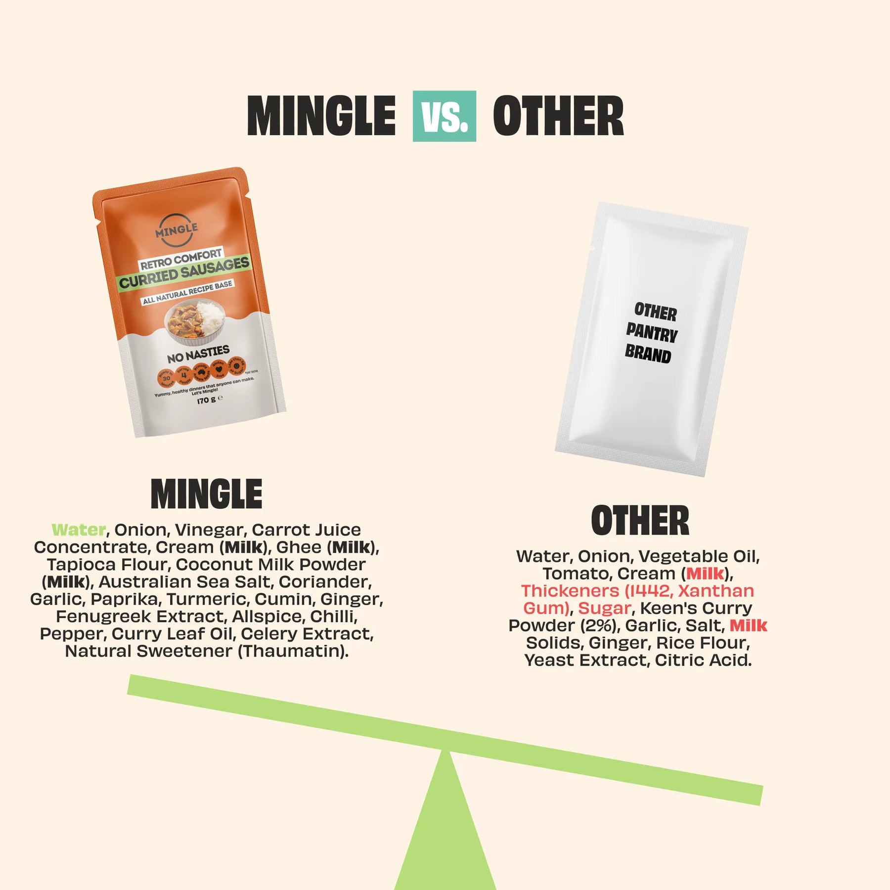 Ingredients: Water, Onion, Vinegar, Carrot Juice Concentrate, Cream (Milk), Ghee (Milk), Tapioca Flour, Coconut Milk Powder (Milk), Australian Sea Salt, Coriander, Garlic, Paprika, Turmeric, Cumin, Ginger, Fenugreek Extract, Allspice, Chilli, Pepper, Curry Leaf Oil, Celery Extract, Natural Sweetener (Thaumatin). Contains: Milk.